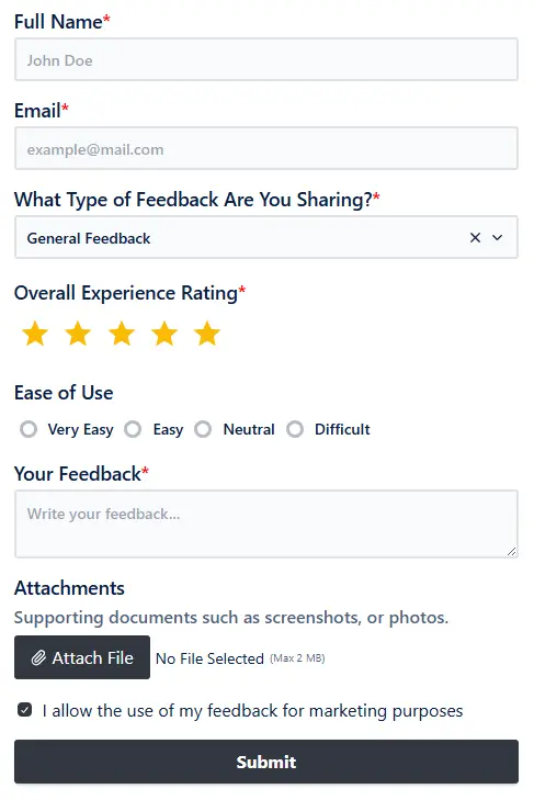 The plugin focuses on performance and flexibility. Forms load fast and remain responsive across all devices. Bit Form supports feedback use cases like customer satisfaction forms, feature request forms, rating forms, complaint forms, and support feedback.