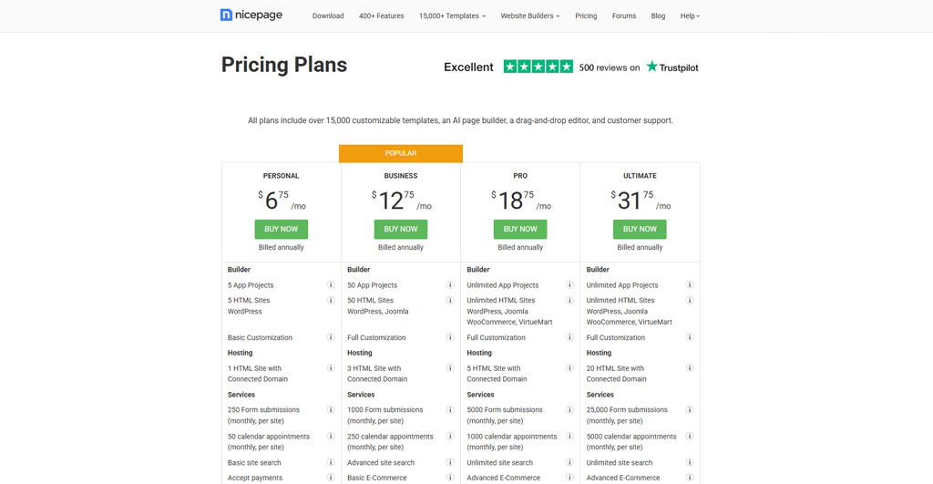 Nicepage offers both one-time license options for the software and hosted plans for the online builder. Public pricing pages list multiple tiers (including a free Starter), with paid personal/business/pro options. If you prefer hosting bundled in, monthly hosted plans are also available.