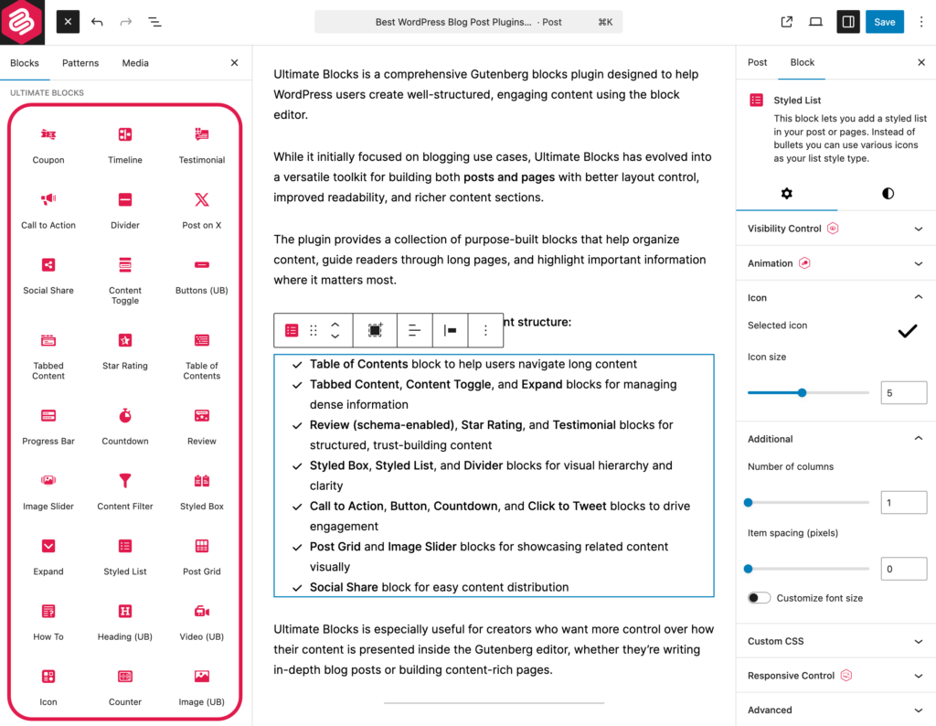 Ultimate Blocks is especially useful for creators who want more control over how their content is presented inside the Gutenberg editor, whether they’re writing in-depth blog posts or building content-rich pages.