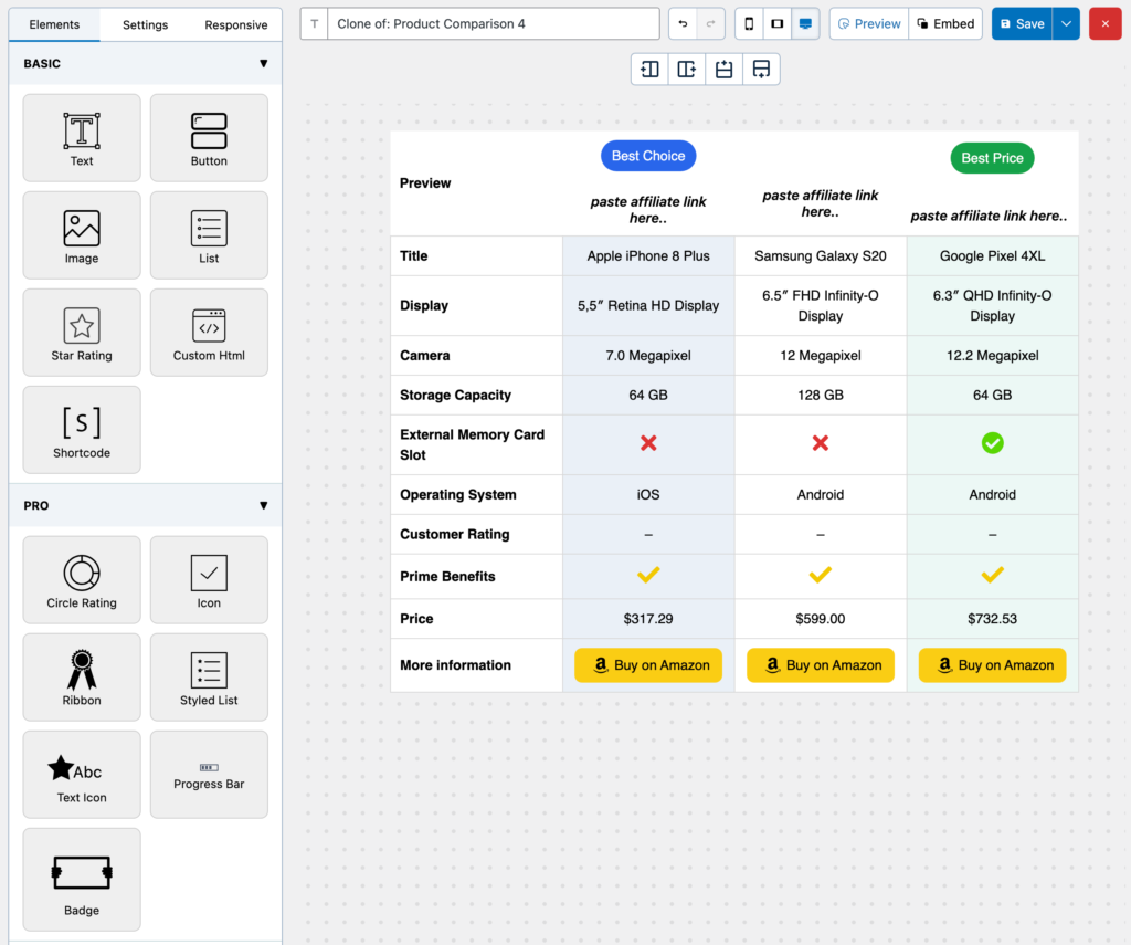 - Comparison tables