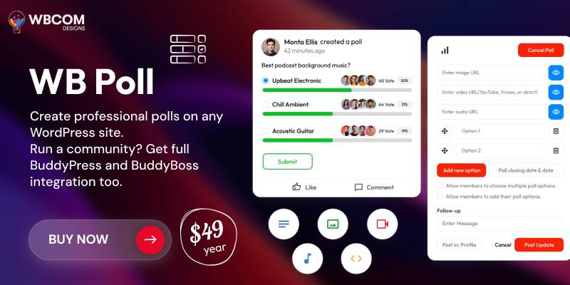 WB Poll by Wbcom Designs is a WordPress voting plugin that gives you two complete poll systems in a single package. It works as a standalone solution on any WordPress site with no community plugin needed, and also offers deep native integration with BuddyPress and BuddyBoss for community-driven sites.