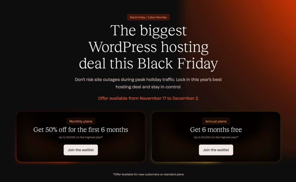 As WP Engine offers managed hosting only, it’s a bit more costly than the shared hosts. The most basic plan starts from $15month. Now the good news is you can get four months of free hosting by paying annually. This deal is only for the Black Friday season.
