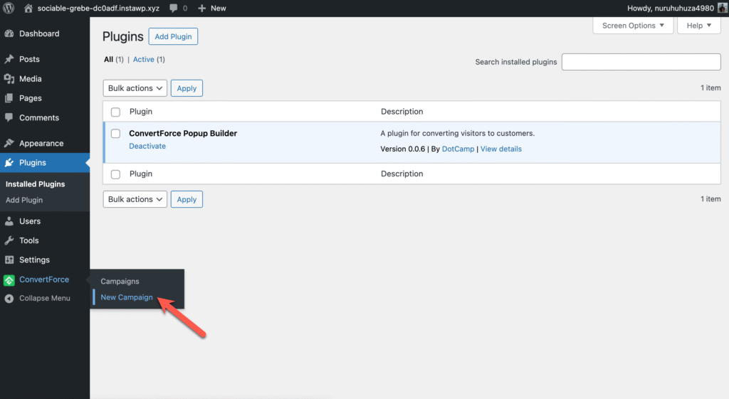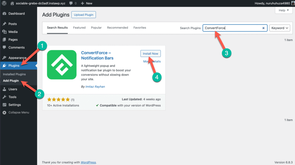 Go to your WordPress Dashboard → Plugins → Add New Plugin and search for “ConvertForce.” Once you find it, click Install Now, then Activate.