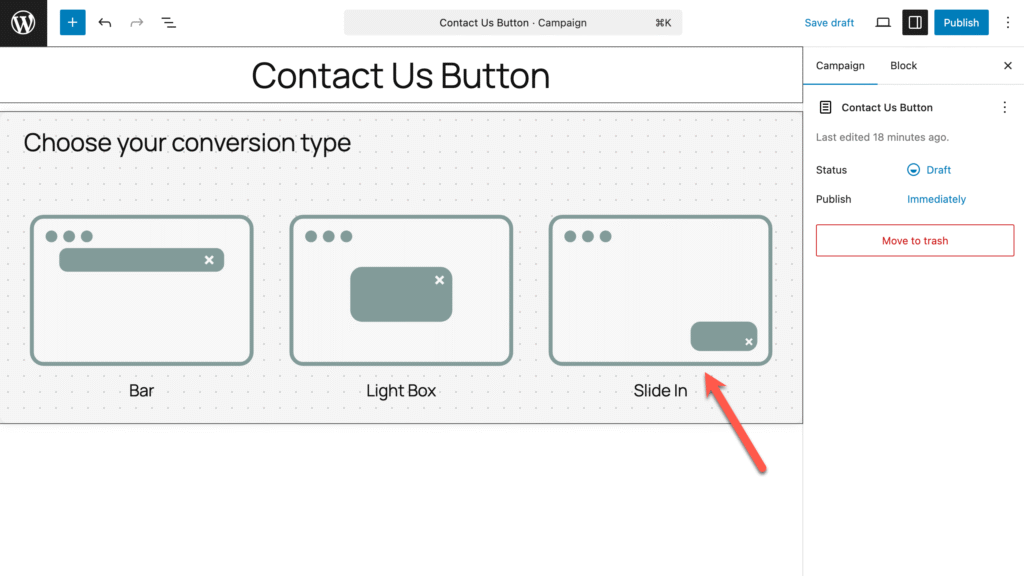 You’ll be prompted to choose a campaign type. Select Slide-in as your campaign type – this layout allows us to position a button that can float at the edge of the screen.