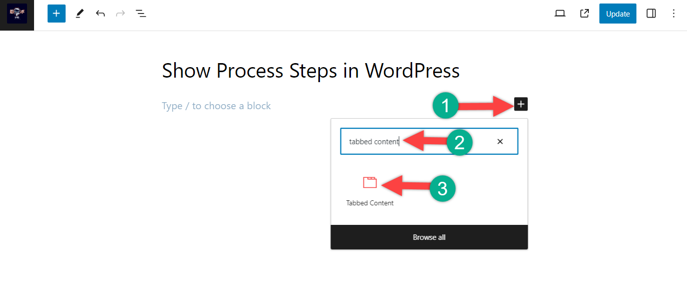 Go to the post editor, click the + icon, and search for ‘Tabbed Content’. Then click on the Tabbed Content block to insert it.